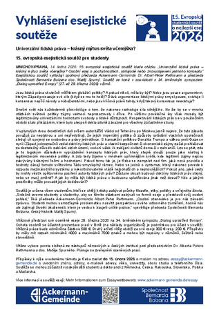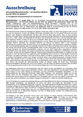 Beim 15. Europäischen Essaywettbewerb sind Studierende aus Deutschland, Tschechien, Österreich der Slowakei und anderen Ländern Ostmitteleuropas eingeladen, sich mit der Frage der Zukunftsfähigkeit des Konzepts der Menschenrechte zu befassen. Das Thema lautet: „Universelle Menschenrechte – ein herrlicher Mythos aus der Welt von gestern? Ein persönlicher Essay über die Zweifel, Verteidigung oder die Wiederentdeckung eines Konzepts“ Ausgelobt wird er vom Bundesvorsitzenden der Ackermann-Gemeinde, Dr. Albert-Peter Rethmann, und dem Vorsitzenden der Bernard-Bolzano-Gesellschaft, Doz. Dr. Matěj Spurný. Der Wettbewerb findet im Zusammenhang mit dem 34. Brünner Symposium „Dialog in der Mitte Europas“ (27. bis 29. März 2026) in Brünn/Brno statt.