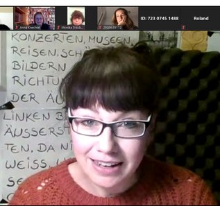 Insgesamt 37 Bildschirme waren zugeschaltet, was bei vielen Paaren und Familien wohl gut 60 Teilnehmer bedeutet. Moderatorin Sandra Uhlich stellte die Schauspielerin, Sängerin, Sprecherin und Erzählerin Janina Klinger kurz vor und hob besonders deren aktuelle Präsenz auf Facebook und Youtube hervor, wo sie angesichts der geschlossenen Stätten für Kinder Märchen und Geschichten für die Kleinen vorliest – auch um die Situation in den Familien zu entspannen.