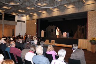 „Es ist für mich eine große Ehre, hier zu sein mit den Studierenden und Mitwirkenden. Ich bin ja selbst in der Ackermann-Gemeinde groß geworden – der Organisation, die sich dieses Werk zum Namen gemacht hat“, erklärte Kopřivová. In ihrer Begrüßung in der Aula des Bildungshauses St. Bernhard. Sie stellte damit den Bezug zur Ackermann-Gemeinde her, die – wie der Ackermann in der Oper – das Schicksal des Verlustes (der Frau bzw. der Heimat) aus christlichem Geist bewältigen will. „Es ist großartig, dass ich 70 Jahre nach der Gründung der Freiburger Ackermann-Gemeinde hier stehen und ein Werk aufführen kann, das erst 17 Jahre alt ist. Und es ist eine Besonderheit, dass das Thema des Textes auch in die Musik verwebt wurde. Es ist nicht nur eine Metapher für Leben und Tod, sondern hat auch viele Bilder aus der Bibel, der Mythologie und der Geschichte zum Inhalt, die wir Ihnen näher bringen wollen“, erläuterte die Regisseurin. Sie dankte der Ackermann-Gemeinde und den weiteren Organisatoren und Unterstützern, ohne die die Aufführung nicht möglich gewesen wäre.