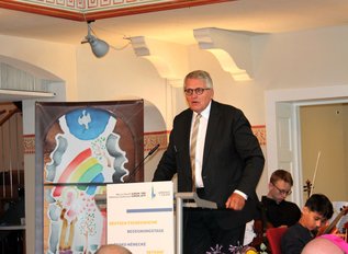 Bei der Feierstunde am Sonntagmorgen hielt der Präsident des Zentralkomitees der deutschen Katholiken Prof. Dr. Thomas Sternberg zum Tagungsthema „Europa – Mut zur Zukunft“ die Festrede. „Ich bin begeistert, was die Ackermann-Gemeinde auf die Beine stellt“, zollte er zunächst Anerkennung für die Veranstalter. In der Folge der Ereignisse von 1989/90 sei der Kulturraum Mitteleuropa deutlich erlebbar, und es werde sichtbar, „wie europäisch diese Länder sind und waren“, so der ZdK-Präsident. Mit dem Schengen-Abkommen sei dieser Raum zudem grenzenlos geworden, was das Zusammenwachsen erleichtere. Doch momentan würden, so Sternberg, Anzeichen auf eine Verschlechterung der Zustände hinweisen: Nationalismus, Brexit, rechtspopulistische und nationalistische Bewegungen usw. „Die mittel- und osteuropäischen Länder schotten sich ab. Ist die Idee eines geeinten Europas obsolet geworden?“, fragte der ranghöchste katholische Laie Deutschlands. Als mögliche Gründe nannte er die Bürokratie sowie eine „mangelhafte Medienpräsenz europäischer Politik – und die Kernfrage: Welches Europa wollen wir?“ Damit gelangte Sternberg zu wichtigen Aspekten wie der europäischen Identität bzw. dem europäischen Selbstverständnis („Wir“ - Gruppenzugehörigkeit). „Europa war nie einfach Europa. Es musste sich immer erst als Europa begreifen. Europa ist ein Raum, der sich durch Religion bzw. Kultur und Geschichte herausgebildet und sich weltweit durchgesetzt hat“, stellte Sternberg fest. Das 19. Jahrhundert (Aufkommen des Nationalismus) und besonders das 20. Jahrhundert (Ende des Kolonialismus, stärkere Bedeutung asiatischer und islamischer Kulturen) habe den bisherigen Zentralismus jedoch beendet. Dennoch habe die Kultur vielfach religiöse und christliche Grundlagen, „ohne seine religiösen Wurzeln ist Europa nicht zu verstehen“, erklärte der ZdK-Präsident. Das reiche von Übersetzungen der Bibel über Kirchenbauten (Architektur), bildende Kunst, Musik und Literatur bis hin zur Liturgie und verschiedenen Frömmigkeitsformen. „Nationale Grenzen waren und sind für die Künste nie relevant. Und religiöse Aspekte prägen die Kultur“, wies Sternberg auch auf den Aspekt „Brauchtum und Feste“ hin. Er verschwieg aber den Einfluss anderer Kulturen und Religionen nicht. „Europa war immer erfolgreich, wenn es sich offen für Fremdes und Neues zeigte und es sich aneignete. All das bestimmt die Identität Europas, sie war immer mehr als eine nationale Kultur“, fasste der Referent diesen Teilaspekt zusammen.