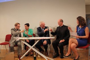 Beim gemütlichen Plausch am Bügelbrett erzählten die Ehrengäste von ihren Bezügen zum Jahr 1989. Daniel Herman, zum Teil im Böhmerwald aufgewachsen, erinnerte sich an die Kirchenglocken von Haidmühle („ein Schwall der Freiheit“), woraus die Aufgabe entstanden sei, für diese Freiheit zu kämpfen und diese mit Leben zu füllen. Doch er ist auch davon überzeugt, dass dieser Prozess mehr als zwei Generationen dauern werde. „Jugendliche, die Unfreiheit nicht erlebt haben, erleben die Welt anders“, meinte Martin Kastler und warb daher für Gespräche mit Zeitzeugen. Seine Eindrücke in Berlin kurz nach dem Mauerfall schilderte Oberbürgermeister Putz. „Es war überhaupt nicht klar, ob es gut ausgeht“, erinnerte sich Generalkonsulin Larischová und sprach von Ängsten und Begeisterung bei den Demonstrationen im November 1989. Ähnlich äußerte sich der Erfurter Weihbischof Dr. Reinhard Hauke mit Blick auf die DDR. „Es war spannend und beängstigend, wie die Demonstration ausgehen würden“. Das große bürgerschaftliche Engagement dieser Monate hob Joachim Unterländer, Vorsitzender des Landeskomitees der Katholiken in Bayern, hervor und wünschte eine „Wiederbelebung dieses Geistes“. Die enge Verknüpfung der damaligen Ereignisse mit seinem Leben schilderte Dr. Petr Křížek. Er nahm im November 1989 an der Wallfahrt nach Rom zur Heiligsprechung der Seligen Agnes von Böhmen teil, lernte dort seine spätere Frau kennen, erlebte in der Heiligen Stadt auch den Mauerfall und war danach bei den Demos in Prag dabei.