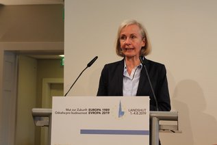 Zum Thema „Europa 1989 – Europa 2019: Enttäuschte Hoffnungen?“ brachte Gräfin Róża zu Thun-Hohenstein, polnische Europaabgeordnete, als Grundlage für die anschließende Podiumsdiskussion ein Eingangsstatement. „Bestimmt gibt es Erwartungen, die nicht erfüllt wurden. Aber nicht immer ist uns bewusst, welche tolle gemeinsame Heimat wir geschaffen haben“, stellte sie einleitend fest. Der Euphorie von 1989 mit mutigen Politikern wie Havel, Walesa, Kohl, Mitterand und Delors stünden der Brexit gegenüber bzw. „Länder, die die gemeinsamen Regeln brechen“. Drei Gründe nannte sie für diese Entwicklung: eine nicht ausreichende Identifikation mit Europa und der Demokratie vor allem in den östlichen Ländern. Die Rechtsstaatlichkeit steht nicht an erster Stelle der Politik, obwohl diese Basis jedes demokratischen Systems ist. Und die Debatte gemeinsames Europa versus zwischenstaatliches Europa. Gemeinsame Projekte könnten dem entgegenwirken. Ferner fehlten eine europäische Öffentlichkeit (TV, Zeitung etc.) und eine gemeinsame Sprache. „Mit der Umsetzung und Verwurzelung konkreter Projekte wird unser Europa funktionieren – die beste gemeinsame Heimat“, schloss Gräfin Róża zu Thun-Hohenstein ihr Statement.