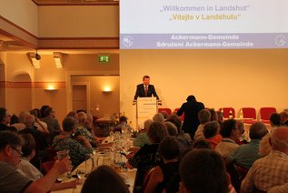 „Wir wollen miteinander gedenken und Mut machen für Europa, ein Signal setzen für ein gemeinsames, freies Europa“, stellte der Bundesvorsitzende der Ackermann-Gemeinde Martin Kastler MdEP a.D. zu Beginn seiner Begrüßung fest. Dabei wies er auch auf den europäischen Charakter der gastgebenden Stadt Landshut und die christliche Prägung der beiden veranstaltenden Verbände hin. „Die Gestaltung der deutsch-tschechischen Nachbarschaft bleibt unsere Hauptaufgabe. Wir bringen Menschen zusammen – auch das ist Europa“, sagte der Bundesvorsitzende mit Blick auf die große Zahl an Teilnehmerinnen und Teilnehmern – aus unterschiedlichen Regionen sowie den verschiedenen internen Gruppierungen sowohl der Ackermann-Gemeinde wie auch der Sdružení Ackermann-Gemeinde. Besonders wies Kastler auf das „Landshuter Signal für Europa“ hin, welches ein deutliches Zeichen nach außen in die Öffentlichkeit geben soll: „Wir bringen Menschen zusammen und Europa voran“, so der Bundesvorsitzende am Ende seiner Eröffnungsrede.