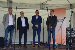 Nachdem sich die Picknick-Teilnehmer gestärkt hatten und auch das Wetter etwas besser wurde, ging es mit dem Programm weiter – mit der ersten Gesprächsrunde zum Thema „Partnerschaften und politische grenzüberschreitende Arbeit“. Unter anderem mit der Stadt Klenci pod Cerchovem/Klentsch pflegt die Stadt Waldmünchen eine Städtepartnerschaft. „Selbstverständlich sind gegenseitige Besuche. Ich genieße die Gespräche mit den Kollegen und bin gerne bei gesellschaftlichen Veranstaltungen, um die Partnerschaft voranzubringen“, stellte Waldmünchens Bürgermeister Markus Ackermann fest. Wichtig für ihn wäre eine Institutionalisierung der Kontakte zwischen Einrichtungen, die sich in diesem Feld engagieren. Mit Blick auf die Vertreibung der Deutschen und den vier Jahrzehnte währenden Eisernen Vorhang zeigte sich Franz Former, 3. Bürgermeister der Stadt Furth im Wald, die eine Städtepartnerschaft mit Taus hat, erfreut, dass sich die Beziehungen normalisiert haben, „die Menschen beiderseits der Grenze wieder aufeinander zugehen können“. Auch die Möglichkeit, sich auf allen Ebenen treffen zu können (vom Kindergarten und der Schule bis zur Polizei und Feuerwehr), bietet für ihn die Chance, „in Friede und Freundschaft miteinander zu leben“. Der aus der Region Taus stammende und in Taus lebende Hauptmann des Pilsner Kreises Rudolf Špoták verwies auf mehrere Partner in Deutschland, am stärksten sei aber die Kooperation mit der Oberpfalz. „Die Partnerschaft ist auf einem sehr guten Weg, beide Regionen bringen sich stark ein“, betonte er. Miteinander angepackt würden Themen wie Digitalisierung sowie ökologische Aspekte. Weiterhin als zentrale Aufgabe sieht er die Verbesserung der Bahnverbindung zwischen Prag und München, die in vier Stunden möglich sein sollte. Die von Špoták angerissenen Themen griff auch Florian Luderschmid, Regierungsvizepräsident der Oberpfalz (ab September Regierungspräsident von Oberfranken) auf. Er nannte aber auch weitere wirtschaftliche Themen (Arbeits- bzw. Fachkräftemangel) und die enge Zusammenarbeit von Feuerwehr, Rettungsdienst und Polizei im grenznahen Raum. „Nur so funktioniert das Zusammenwachsen“, fasste Luderschmid zusammen. Er wies aber auch geselligen und kulturellen Veranstaltungen wie diesem Picknick eine große Bedeutung zu.