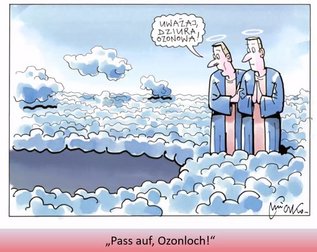 Damit einher gehen aber auch Belange wie Nationalgeist auf der einen und Geist der Freundschaft und Zusammenarbeit auf der anderen Seite, wie es eine Karikatur aufzeigte. Bei diesem Streit der Werte sei es in den letzten acht Jahren zu einer Spaltung des Landes gekommen – bis hin zu zerrütteten Familien und auseinandergebrochenen Freundschaften. Der Klimawandel, das Stopfen des Ozonloches – diese Dinge werden bei der hohen Abhängigkeit Polens von der Kohle ebenfalls problematisch, und per Karikatur dargestellt. Als weiteres Thema sprach Kneip das Verhältnis Polens bzw. der Polen zur EU an und brachte es auf den Punkt: „Die Polen sind auch begeisterte Europäer, haben aber Probleme mit der Europäischen Union.“ Als letzte Themen ging der Schriftsteller auf die Alkohol-Problematik – „Polen ist eher ein Bierland“ – und die Digitalisierung („Polen ist eines der schnellsten digitalisierten Länder Europas“) ein und schloss mit der Karikatur von Andrzej Mleczko, in der Gott die kaputte Welt zur Reparatur bringt.