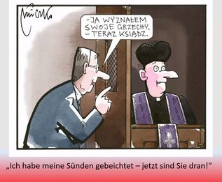 Ein zentrales Thema ist auch die katholische Kirche, die lange Zeit als Bestandteil des polnischen Nationalbewusstseins galt. „Aktuell ist eine große Abwendung von der Kirche festzustellen, vor allem die junge Generation hat nicht mehr den Bezug. Seit 1989 gilt der Kommerz als große Kraft neben der Kirche“, beschrieb Kneip die Situation und zeigte zu dieser Thematik einige Karikaturen. So zum Beispiel den Export polnischer Priester und im Gegenzug den Import liberaler gesellschaftlicher Werte. „Polen gehört heute zu den am schnellsten säkularisierenden Ländern“, stellte der Vortragende fest. Gründe sind für ihn unter anderem das Bündnis der letzten Regierung mit der Kirche, das überaus strikte Abtreibungsrecht und die Missbrauchsskandale. „Die junge Generation kommt vom Glauben ab, Polen hat kaum noch Priester – insgesamt eine tragische und traurige Entwicklung“, fasste Kneip diesen Themenbereich zusammen, bei dem auch die Aspekte „Konsum“ und „Kapitalismus“ hereinspielen.