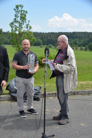Auf die Historie der Ackermann-Gemeinde ging Karl-Ludwig Ritzke, der Vorsitzende der Ackermann-Gemeinde im Bistum Regensburg, in seinem Grußwort ein. „Seit 1946 war und ist es ein wichtiges Anliegen für die Ackermann-Gemeinde, über die Grenzen hinweg vor allem im christlichen Glauben Freundschaft zu schließen.“ Ritzke verwies auf die Aspekte gegenseitige Vergebung, Versöhnung und gutes Kennenlernen, Hilfestellung beim Aufbau sowie Partnerschaften auf gleicher Augenhöhe. Besonders erfreut zeigte er sich über das Engagement der jungen Generation insbesondere bei den Veranstaltungen „Samstage für Nachbarschaft“ und dankte namentlich Christoph Mauerer, Marcus Reinert und Florian Würsch sowie auf tschechischer Seite dem Ehepaar Barbora und Štěpán Špád aus Klattau. „Dass das Grenzland nicht zur Grenze wurde, dazu haben viele Partnerschaften beigetragen“, lobte Ritzke die Politiker und Bürgermeister der beiderseits an der Grenze liegenden Kommunen. Speziell bei Bürgermeister Bernard bedankte er sich mit einer Flasche Wein.
