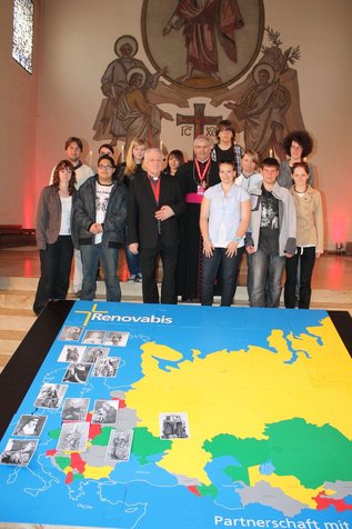 Die Sankt-Peter-Kirche hatte ihre Pforten weit geöffnet, und man hörte schon von weitem jungen Chorgesang. Es waren die Schülerinnen und Schüler vom Bischöflichen Gymnasium in Pilsen, die mit ihrem Lehrer Tomaš Kendl und seiner Kollegin die Zeit vor dem Gottesdienst noch schnell für eine Chorprobe nutzten. Währenddessen sah man den frisch geweihten Priester Peter Bretl, wie er mit Hand anlegte beim Aufbau des Renovabis-Europa-Puzzle, an dem sich Geschäftsführer Matthias Dörr mit Helferinnen und Helfern schon eine Weile versucht hatte. Jedenfalls war alles fertig bis zum feierlichen Einzug der Zelebranten: Weihbischof Dr. Reinhard Hauke, Erfurt, Bischof Dr. Ladislav Hučko, griechisch-orthodoxer Exarch, Prag, die Visitatoren Dr. Joachim Giela, zuständig für Breslau/Branitz/Glatz und Msgr. Dr. Alexander Hoffmann, für die Deutschen aus Russland, P. Stefan Dartmann SJ, Hautgeschäftsführer Renovabis, Dr. Ludwig Weiß, Geistlicher Beirat Ackermann-Gemeinde und Diözesanvertriebenenseelsorger Freiburg, und natürlich der Neupriester Peter Bretl aus dem Kreis der Ackermann-Gemeinde. Bischof Dr. Hauke, Vertriebenen- und Aussiedlerbeauftragter der Deutschen Bischofskonferenz, wies angesichts von acht Prozent katholischer und 25 Prozent evangelischer Christen im Bistum Erfurt auf die Notwendigkeit hin, das Evangelium nach außen sichtbar zu machen und beispielhaft aus seinem Geiste zu leben, wie es die Heiligen zu allen Zeiten getan hätten. Das gelte heute überall, nicht nur in der Diözese Erfurt. Dabei komme den Heiligen, die nicht nur von einer europäischen Nation verehrt werden, besondere Bedeutung zu. Sie können, wie der heilige Johannes von Nepomuk im Verhältnis von Deutschen und Tschechen, völkerverbindende Funktion entfalten und die Christen Europas zusammenführen. Dazu gehörten auch Elisabeth von Thüringen-Ungarn, Maximilian Kolbe, der sein Leben in einem von Deutschen eingerichteten Vernichtungslager für einen anderen hingab, Edith Stein, die als Christin für ihr jüdischen Brüder und Schwestern in den Tod ging und mit Katharina von Siena und Birgitta von Schweden zu Patroninnen Europas ernannt wurde, die wie Benedikt von Nursia und Cyrill und Method als Patrone Europas Symbolfiguren für das christliche Fundament Europas und den Zusammenhalt der europäischen Christen sind. Auch Agnes von Böhmen, die kurz vor der Samtenen Revolution heilig gesprochen wurde sowie Adalbert von Prag seien in diesem Zusammenhang zu nennen. Ihre Anrufung und Verehrung soll den Frieden und die Gerechtigkeit in Europa sichern mit Christus als Fundament und der Gottesmutter Maria als alle überragende Heilige. Zu ihren Ehren sang der Chor „Heimatmelodie“ der Russlanddeutschen aus Augsburg ergreifende Marienlieder.
