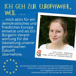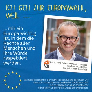 Als Ackermann-Gemeinde ist uns die europäische Integration - das erfolgreichste Friedensprojekt der Geschichte! - immer schon ein besonderes Anliegen. Die Europawahl in diesem Jahr ist uns daher nicht gleichgültig! Wir nehmen in einigen Teilen der Gesellschaften ein Erstarken von nationalistischem und extremistischem Denken wahr, und auch anti-europäische Stimmen werden immer lauter. Dem wollen wir entschieden entgegentreten und aktiv ein sichtbares Zeichen für Europa, für die Demokratie und die europäischen Werte setzen. Schon im „Landshuter Signal für Europa“, erstellt bei den Deutsch-tschechischen Begegnungstagen der Ackermann-Gemeinde in Landshut im Jahr 2019, haben wir dies festgestellt. Wir sind davon überzeugt, dass Europa Bürgerengagement, Solidarität und Demokratie braucht und Nationalismus keine Zukunft in sich trägt.
