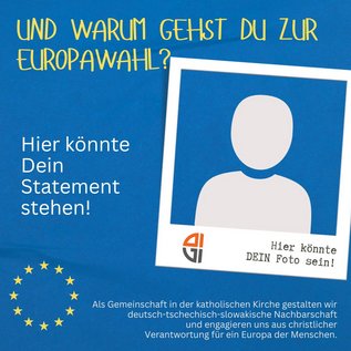 Wenn auch Sie Ihr Gesicht zeigen wollen für Europa, für die Demokratie und für die europäischen Werte, können Sie uns gerne Ihr Statement schicken plus ein Foto oder ein kurzes (max. 20 Sekunden) Video, dann erstellen wir Ihnen nach dem Vorbild (siehe oben) ein solches Bild als .jpg und senden es Ihnen zu, damit Sie dies veröffentlichen können. Außerdem verwenden wir Ihr Bild auf unseren Kanälen, um im Rahmen dieser Kampagne sichtbar zu machen, dass wir als Ackermann-Gemeinde Europäerinnen und Europäer sind und für ein demokratisches Europa stehen, und auch andere Menschen überzeugen wollen, selbst zur Wahl zu gehen.