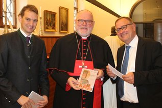 Diese Rede findet auch Erwähnung in der jüngst von der Ackermann-Gemeinde herausgegebenen Studie "Altbunzlau/Stará Boleslav. Ein wiederentdeckter Wallfahrtsort" des Kirchenhistorikers Professor Stefan Samerski. Sie zeichnet die wechselvolle Geschichte der Wallfahrten an den Ort des Martyriums des böhmischen Landespatrons nach, die stets auch ganz ein Spiegel ihrer Zeit waren. Visitator Msgr. Dieter Olbrich (rechts), Geistlicher Beirat der Ackermann-Gemeinde (AG), konnte am vergangenen Wochenende Kardinal Marx die Publikation überreichen. Gemeinsam mit dem AG-Bundesgeschäftsführer Matthias Dörr (links) erinnert er an die letztjährige Wenzelswallfahrt und berichtete dem Bischofskonferenzvorsitzenden von aktuellen Entwicklungen in der Kirche des Nachbarlandes.
