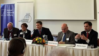 Nach dem Zustand des vereinigten Europa fragte zum Abschluss der Konferenz am Sonntagvormittag eine Podiumsdiskussion unter der Moderation des Schweizer Historikers Dr. Adrian Portmann-von Arburg. Josef Zieleniec, erster Außenminister der Tschechischen Republik und ehemaliger Europaabgeordnete, sieht mit Sorge, dass die Europäische Union beginne, „an sich selbst zu zweifeln“. Dabei gebe es mit Blick auf neue ökonomische und politische Mächte sowie angesichts des neuen Selbstbewusstseins der islamischen Welt die Notwendigkeit einer gemeinsamen europäischen Antwort. Darum mahnt der ehemalige tschechische Spitzendiplomat eine „Vervollkommnung der EU“ an. Die Vertreterin des Freistaates Sachsen Stefanie Rehm erinnerte daran, dass die DDR im Gegensatz zu den anderen Staaten des ehemaligen Ostblocks durch die Wiedervereinigung direkt Mitglied der Europäischen Gemeinschaft wurde. Sie empfinde dies als ein großes Glück und spüre hierfür Dankbarkeit. Die ehemalige Staatsministerin sieht jedoch die Gefahr, dass Europa dabei sei, sich auseinanderzudividieren. Der Frust über Europa sei in den letzten Monaten immer größer geworden, „da wir Europa nur als wirtschaftliche Macht wahrnehmen“, so Rehm. Die europäische Einigung dürfe nicht auf „Projektwochen reduziert werden“ mahnte die studierte Pädagogin. „Es braucht mehr Menschen, die sich dafür engagieren.“ Den „Kontakt von Mensch zu Mensch“ hält der stellvertretende österreichische Botschafter in Prag Martin Hojni für ein zentrales Element des zusammenwachsenden Europas. Darauf basiere auch, dass es heute „die besten österreichisch-tschechischen Beziehungen seit 1918“ gebe. Mit Sorge sieht er jedoch die große Unterschiedlichkeit der Akteure auf europäischer Ebene. Dies bedeute oft eine Schwächung der EU-Position, wie es sich auch lange Zeit bei dem Agieren zu den Entwicklungen in der Ukraine gezeigt habe. Die Bedeutung der Werte für Europa betonte der tschische Kulturminister und frisch gewählte Vorsitzende der Sdružení Ackermann-Gemeinde Daniel Herman. „Demokratie kann nur dann funktionieren, wenn es Werte gibt, die allgemein akzeptiert und nicht Gegenstand von Diskussionen sind.“ Als ein Bindeglied der europäischen Gesellschaften sieht der christliche Politiker die Zehn Gebote. „Wenn wir diese annehmen und uns dafür nicht schämen“, dann „können wir denen, die zu uns kommen und die mit uns im Kontakt stehen, etwas anbieten“, ist sich Herman sicher. Zum Abschluss hob der Kulturminister die Bedeutung des Dialogs hervor. „Zu Katastrophen kommt es nur, wenn es keinen Dialog gibt.“ Daher brauche es Dialog auf allen Ebenen.