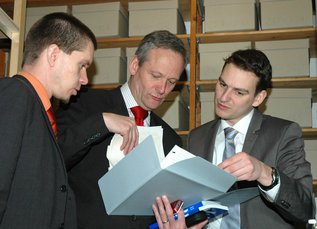 Bei einem Rundgang durch die Geschäftsstelle zeigte Svoboda großes Interesse am Archiv der Ackermann-Gemeinde. Dieses dokumentiert eindrucksvoll die Unterstützung der verfolgten Kirche in der kommunistischen Tschechoslowakei. Hiervon zeugen unzählige Ordner voll Briefkorrespondenzen mit Priestern. Matthias Dörr, Bundesgeschäftsführer der Ackermann-Gemeinde, zeigte unter anderem einen Brief des heutigen Prager Kardinals Miloslav Vlk aus den 80er Jahren, in dem er davon berichtete, dass er als Fensterputzer arbeiten müsse.