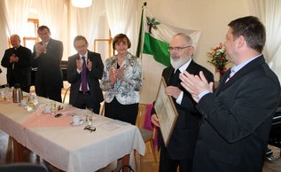 Otte, viele Jahre Geistlicher Beirat der Ackermann-Gemeinde und seit 1991 Repräsentant dieser katholischen Gemeinschaft in Prag, wurde 1939 in Weidenau geboren. Trotz vorherigen Beschlusses wurde seine Familie jedoch nach Kriegsende nicht vertrieben. „Er erlebte hier eine Kindheit, die voller Hass zu allem Deutschen war“, so der Bürgermeister. Dennoch sei es sein „inniger Wunsch“ gewesen, freundschaftliche Kontakte „zu der Stadt, die, wie er sagt, sein zweites Daheim ist“, aufzunehmen. Die ersten Kontakte gehen in das Jahr 1991 zurück. Gemeinsam mit Professor Rudolf Grimme habe er das Fundament für die spätere Partnerschaft zwischen Weidenau und Großkrosse/Velká Kraš mit dem Heimatbund Weidenau-Großkrosse und seiner Patenstadt Neuburg an der Donau gelegt, erinnert Kačora. Auch bei der Realisierung zahlreicher Projekte in Weidenau sei er „Motor und Seele“ gewesen. Der Bürgermeister benannte dabei das Haus der Partnerschaft mit einem Museum, den Brunnen auf dem Marktplatz, das Denkmal auf dem Friedhof und den Neuburger Stein an der Schlossmauer. Bei seinem Wirken habe „sein außergewöhnliches Charisma, seine Liebenswürdigkeit, Herzenswärme und seine Überzeugungskraft“ eine große Rolle gespielt, würdigt Kačora den neuen Ehrenbürger. Die Entscheidung der Vertreter von Weidenau sei „Ausdruck großer Hochachtung unserer Bürger für Ihr opferwilliges Wirken“.