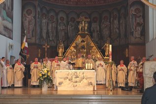 Als Thema stand über der Eucharistiefeier der Spruch des Heiligen Johannes Paul II. „Christus: Quelle der Hoffnung für Europa“. Dies nahm auch Pfarrer Peter Zillich, der in der Diözese Regensburg wirkende Vertriebenenseelsorger, in seiner Begrüßung auf. „Nur das bringt Frucht, was auf dem Acker der Versöhnung wächst. Dass wir heute so viele Völker und so viele Nationen darstellen, das ist auch ein Zeichen, dass wir eins sind in Jesus Christus, dass unsere Zukunft auch auf diesem versöhnten Acker weiter wächst“, so Pfarrer Zillich.