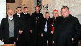 Begegnung in Břevnov (v.l.) zur Erinnerung an Erzabt Anastáz Opasek OSB: Propst Msgr. Anton Otte (Prag-Repräsentant der Ackermann-Gemeinde), Matthias Dörr (Bundesgeschäftsführer der Ackermann-Gemeinde), Prior Frater Franz Neuhausen OSB und Abtadministrator Markus Eller OSB (Kloster Rohr), Adolf Ullmann (Kulturbeauftragter der Ackermann-Gemeinde), Kardinal Dominik Duka, Prior Prokop Siostrzonek OSB (Kloster Břevnov).
