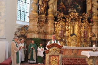 Beim Abschlussgottesdienst am Sonntagvormittag in der Stiftsbasilika St. Martin war Weihbischof Rupert Graf zu Stolberg, Bischofsvikar für die Seelsorgeregion München des Erzbistums München-Freising, der Hauptzelebrant. Die Eucharistiefeier stand unter dem Thema „Nach seinem Bild erneuert“. In seiner Begrüßung nahm der Weihbischof den Aspekt der Begegnung auf und erweiterte ihn um die Begegnung mit Gott bzw. Jesus Christus im Gottesdienst. „Für mich war das Jahr 1989 ein Jahr der Hoffnung und des Aufbruchs“, blickte er in seiner Predigt zurück. Da der Vater des Weihbischofs aus den neuen Bundesländern stammte, war die Heimat nun wieder erreichbar. „Europa sieht jetzt anders aus“, bewertete der Weihbischof die Situation von 2019. Die Hoffnung von 1989 auf ein friedliches Europa, das in eine friedliche Welt eingebettet ist, habe sich scheinbar als „trügerische Hoffnung“ erwiesen. Mit Blick auf die Heimatvertriebenen am Ende und nach dem Zweiten Weltkrieg meinte der Geistliche, dass diese mit ihrem christlichen Weltbild bzw. den christlichen Wurzeln in die neue Heimat gekommen seien. „Das war viel substantieller als aller Besitz, die Basis für den Neubeginn und den Wiederaufbau der Gesellschaft“, erklärte der Weihbischof. 1989/90 sei es entscheidend gewesen, „mit ausgestreckten Händen auf den Anderen zuzugehen. So kann Friede miteinander gelingen“, blickte er zurück. Nun, 2019, habe ein anderes Gedankengut in Europa Einzug gehalten - geprägt von Kräften, „bei denen das christliche Weltbild in den Hintergrund rückt, ja negiert wird. Die europäische Einigung stockt“, so der Weihbischof. Er hofft und wünscht, dass das Tagungsmotto „Mut zur Zukunft“ sich nicht als Durchhalteparole entpuppe, sondern Motivation zu neuem Handeln sei. „Solange es Christen gibt, besteht Hoffnung. Europa braucht uns als Christen. Wir haben Inhalte, die zur Hoffnung beitragen. Wir Christen können Salz und Sauerteig für unseren Kontinent sein. Werden wir nicht müde, eine Gesellschaft aus dem Verständnis des Evangeliums heraus aufzubauen“, motivierte Weihbischof Stolberg.