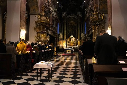 In der Kirche Mariä Himmelfahrt („Jesuitenkirche“) fand der traditionelle deutsch-tschechische Gottesdienst statt – dem Zeitpunkt entsprechend mit der Liturgie des Palmsonntags. Hauptzelebrant war Renovabis-Hauptgeschäftsführer Prof. Dr. Thomas Schwartz, unterstützt von Pater Jan Pacner und Diakon Irenäus Müller. Für die musikalische Umrahmung sorgte Ondřej Múčka, der mit drei weiteren Männern die Passion nach dem Markus-Evangelium sang.