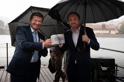 „Ich habe verloren, und ich habe sehr gerne verloren“, so die Worte des tschechischen Außenministers Jakub Kulhánek, der sich gegenüber der Ackermann-Gemeinde geschlagen geben musste. Kulhánek hatte im Vorfeld gewettet, dass es der Ackermann-Gemeinde und ihren Mitstreitern nicht gelingen würde, 27 Boote, versehen mit den 27 Fahnen der EU-Mitgliedsländer, auf die Moldau zu bringen.