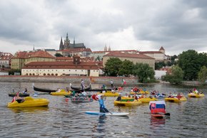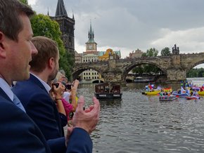 Doch weit gefehlt. Am Ende tummelten sich sogar 29 Schlauch- und Tretboote vor der altehrwürdigen Karlsbrücke. Wahrscheinlich hätte auch deren Erbauer und Namensgeber, Kaiser Karl IV., über solch ein gelungenes Happening nicht schlecht gestaunt. Der tschechische Außenminister nahm es mit Humor und spendete nach verlorener Wette sehr gerne seinen Wetteinsatz, ein Fass guten böhmischen Bieres.