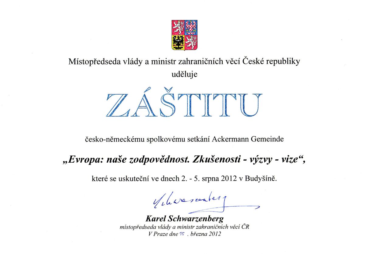 Das Bundestreffen standunter der Schrimherrschaft des tschechischen Vizepremiers und Außenministers Karel Schwarzenberg. Schwarzenberg schrieb an die Ackermann-Gemeinde: "Es freut mich zu sehen, dass die Zusammenarbeit zwischen beiden Partnerorganisationen so gut gedeiht, zugleich möchte ich Ihnen auch meinen Dank für Ihr Engagement und Ihren Beitrag zur besseren Verständigung zwischen Menschen beider Länder ausdrücken." Mit guten Wünschen schließt der tschechische Vizepremier sein Schreiben: "Ich wünsche Ihnen, dass die Ackermann-Gemeinde auch in der Zukunft möglichst viele Menschen mit der Botschaft von Toleranz und Verständigung erreicht."