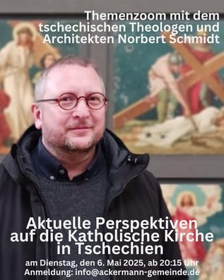 Es ist eine ungewöhnliche Kombination: Norbert Schmidt studierte sowohl Architektur als auch Theologie an der Prager Karlsuniversität studiert. Er arbeitete zunächst vor allem als Architekt und veröffentlichte verschiedene Artikel, die immer wieder die Beziehung von Architektur, Kunst und Theologie reflektierten. 2009 wurde er zudem Leiter des Zentrums für Theologie und Kunst an der Katholischen Fakultät in Prag. Darüber hinaus ist er als Kurator bei der St. Salvator-Kirche in Prag engagiert und organisiert Vorträge und Debatten mit Persönlichkeiten aus Kunst, Architektur und Theologie. Er ist also ein ausgezeichneter Kenner und Beobachter der aktuellen Entwicklungen in der Katholischen Kirche in Tschechien. Jetzt, wo nach dem Tod Papst Franziskus` wieder viele Fragen für die Weltkirche anstehen, wollen wir zu unseren Nachbarn blicken – und es ist höchste Zeit, dass Norbert Schmidt als Referent beim Themenzoom der Ackermann-Gemeinde auftritt.