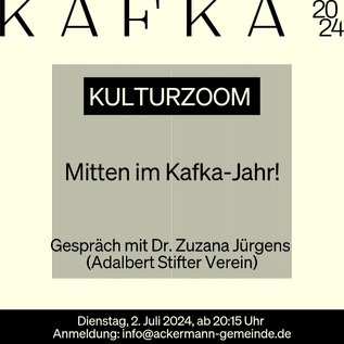 Herzliche Einladung zum Kulturzoom am Dienstag, den 2. Juli 2024 ab 20:15 Uhr! zum Thema "Mitten im Kafka-Jahr"