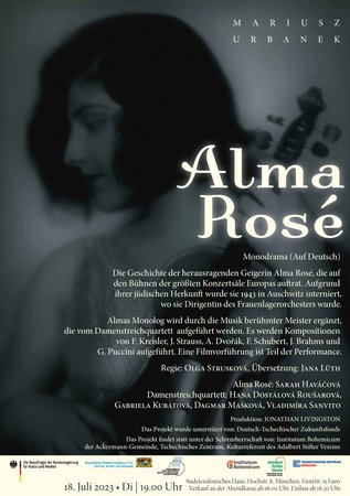Das Monodrama Alma Rosé bringt ihr Leben auf die Bühne. Sarah Haváčová verkörpert Alma Rosé, ein Damenstreichquartett bringt die Musik zu Gehör, wobei Kompositionen großer Musiker aufgeführt werden. So werden die Zuschauer und Zuhörer mit allen Sinnen in die Welt der Alma Rosé hineingenommen.