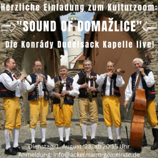Stimmen Sie sich also mit uns ganz auf Domažlice ein und schalten Sie sich zum Kulturzoom der Ackermann-Gemeinde zu mit dem „SOUND OF DOMAŽLICE“ und dem Live-Auftritt der Konrády Dudelsack Kapelle. Um diesen Abend wieder in vollen Zügen zu genießen, raten wir Ihnen dazu, sich ein böhmisches Bier oder ein Glas mährischen Wein bereitzustellen.
