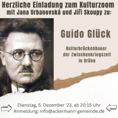 WeiterlesenGuido Glück - Kulturbrückenbauer der Zwischenkriegszeit in Brünn: Wir laden Sie herzlich zum kulturzoom der Ackermann-Gemeinde am Dienstag, den 5. Dezember ab 20:15 Uhr ein, diesmal mit Jana…