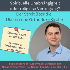 WeiterlesenAm Dienstag, den 5. September 2023 dürfen wir Sie ab 20:15 Uhr wieder zum themenzoom unter dem Motto " Spirituelle Unabhängigkeit oder religiöse Verfolgung? Der Streit über die Ukrainische Orthodoxe…