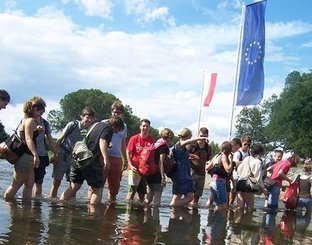 Nach den Workshops am Vormittag ging es am Nachmittag zum Dreiländereck Polen - Deutschland - Tschechien. Dort überquerten wir den Grenzfluss und gelangen so aus Deutschland nach Tschechien bzw. Polen – ohne Grenzen! Nach einer kurzen Andation und dem Steigen lassen von Luftballons, bildeten wir zum Abschluss eine lange Menschenkette, die die Ufer Deutschlands, Tschechiens und Polens überbrückte und verband – das sah so toll aus! Den Tag beendeten wir bei Lagerfeuer und Gitarrenmusik mit Gesang unterm Sternenzelt.
