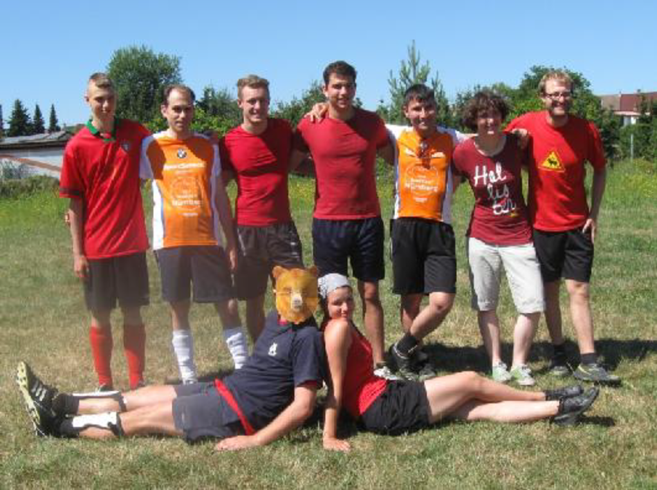 alte Scheune angeschaut. Das hat aber nicht lange gedauert, weil ich Wolfi mit unseren anderen Teammitgliedern gesehen habe. Da waren: Kilian, Julia, Tobi und dann noch Matthias mit seinem Bruder Felix. Nach einer kurzen Begrüßung und dem Kennenlernen war mir gleich klar, wir würden ein gutes Team sein!!! Aber um den Pokal auch wirklich zu holen, sind wir als Team zu unserem Fußballspielplatz gegangen, um zu schauen, wo es stattfinden wird und was für eine Strategie und Technik wir am nächsten Tag anwenden werden. Später gab es noch die Möglichkeit, den Abend mit anderen Fußballspielern draußen bei der Filmprojektion zu verbringen. Da wir aber nach der langen Reise müde waren, waren wir relativ früh schon im Bett und versuchten in der gemütlichen Scheune einzuschlafen.