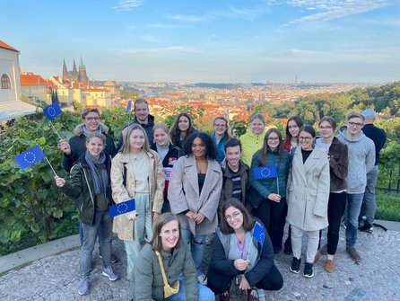 Anschließend an diese aufschlussreiche politische Diskussion begann dann eine kleine Stadtführung mit Christoph Mauerer mit Schwerpunkt auf Institutionen der deutsch-tschechischen Zusammenarbeit. Die erste Station war das Strahov Kloster, eine Abtei des Prämonstratenser-Ordens im Prager Stadtteil Hradčany. Der Ausblick auf die Stadt vom Kloster aus bot uns auch die perfekte Möglichkeit für ein Foto. Vor der deutschen Botschaft erzählte Christoph Mauerer uns vom Jahr 1989, als diese Botschaft in den Blickpunkt der Medien gelangte. Mehrere Wochen lang suchten DDR-Bürger im Garten der Botschaft Zuflucht, bis sie endlich in die Bundesrepublik einreisen konnten. Weitere Stopps waren auch das Verbindungsbüro des Freistaates Bayern in der Nähe der Karlsbrücke und das Moldau-Ufer.